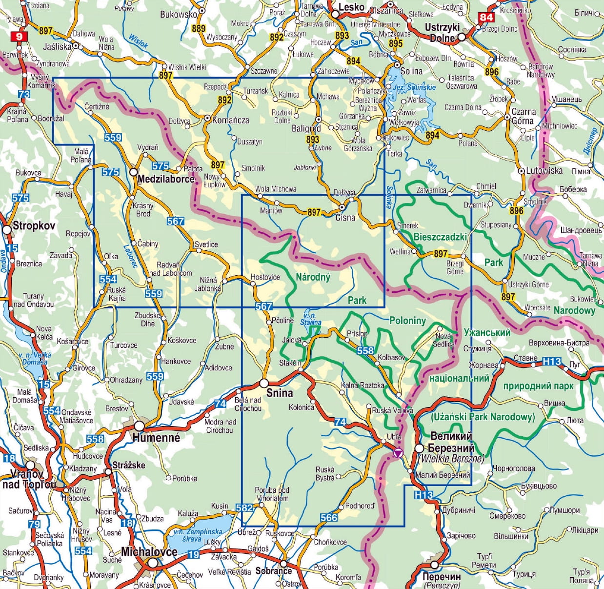 Jest to mapa dwustronna w skali 1:50'000. Od płn. granice mapy wyznaczają Komańcza i Zatwarnica, od zach. - słowackie Medzilaborce, od wsch.- Przełęcz Użocka („worek bieszczadzki”), od płd. Snina i słowacko-ukraińskie przejście graniczne Ubla.
