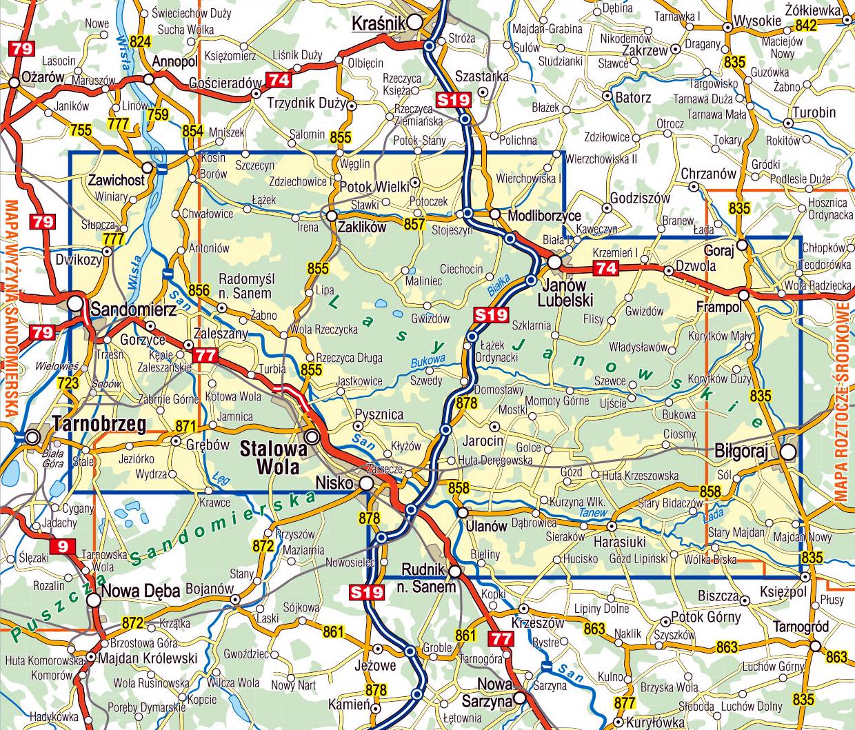 "Lasy Janowskie" – mapa turystyczna w skali 1:50'000 to kompleksowe opracowanie obejmujące cały obszar Parku Krajobrazowego Lasy Janowskie, fragmenty Puszczy Sandomierskiej oraz rozległe tereny przyległe. Mapa swoim zasięgiem obejmuje miejscowości: Janów Lubelski, Goraj i Zawichost na północy, Nisko i Rudnik nad Sanem na południu, Sandomierz na zachodzie oraz Biłgoraj na wschodzie. Stanowi połączenie dwóch innych map – Roztocza Środkowego i Wyżyny Sandomierskiej, tworząc spójny i czytelny obraz regionu.