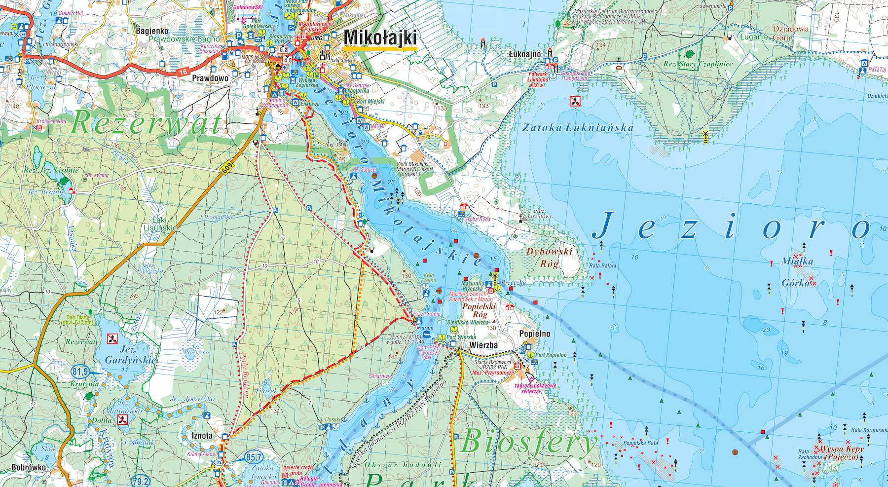 - oznaczenia akwenów żeglownych, stref ciszy oraz miejsc niebezpiecznych,
