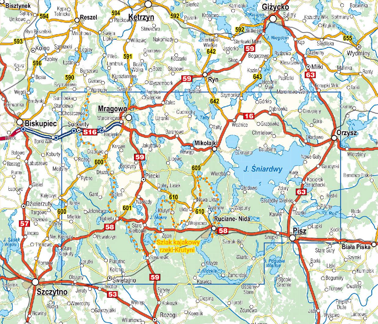 Mazury – mapa turystyczna w skali 1:60 000 przedstawia środkową część Pojezierza Mazurskiego, obejmując m.in. fragment Pojezierza Mrągowskiego, Jezioro Śniardwy oraz rzekę Krutynię – jeden z najpiękniejszych kajakowych szlaków w Polsce. Granice mapy wyznaczają: Orzysz na wschodzie, Sorkwity na zachodzie, Świętajno na południu oraz Mrągowo na północy.