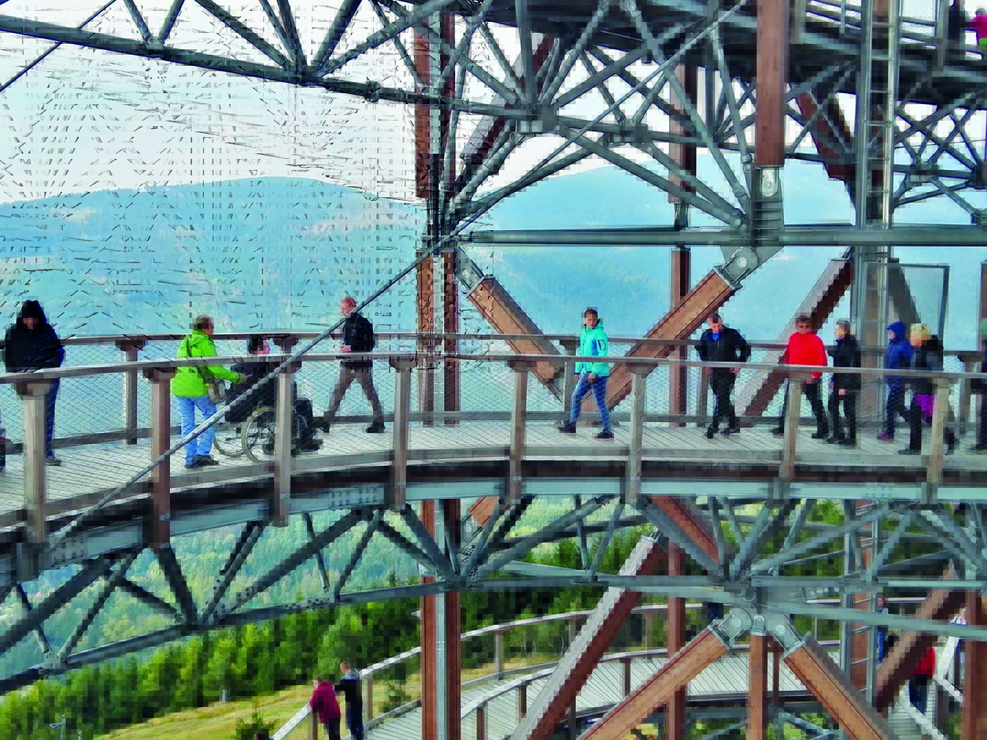 Sky Walk, czyli spacer w chmurach, umożliwia niezwykłej konstrukcji wieża o wysokości 55 m, położona na zboczu góry Slamnik (1116 m n.p.m.). Na sam szczyt prowadzi łagodnie wyprofilowana ścieżka, wzdłuż której ustawiono tablice informacyjne. Ze szczytu rozpościera się szeroka panorama na Masyw Śnieżnika, dolinę rzeki Morawy, grzbiety Jeseników i Karkonosze. Z wieży można zejść tą samą drogą lub – to propozycja tylko dla odważnych – zjechać zjeżdżalnią o długości 101 m! Dodatkową atrakcję stanowią tunele rozciągnięte pomiędzy poszczególnymi piętrami oraz tzw. „gniazda” z sieci na wysuniętych tarasach. Pod wieżę można wjechać kolejką linową.