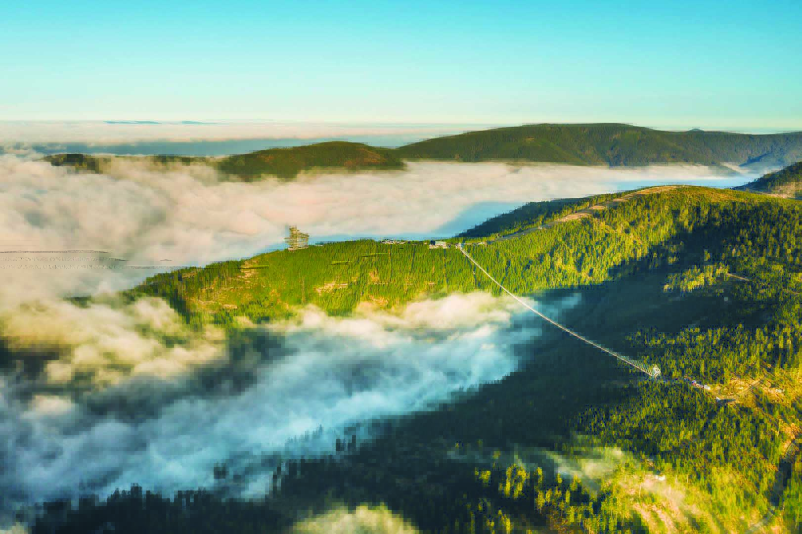 Tuż obok wieży i ścieżki w chmurach znajduje się najnowsza, otwarta latem 2022 r., kolejna atrakcja dla miłośników mocnych wrażeń. Jest nią najdłuższy most wiszący na świecie, rozpięty ponad doliną Moravy. Długość mostu wynosi 721 m, a wysokość nad ziemią w najwyższym miejscu sięga 95 m! Chodnik posiada ażurową konstrukcję, dzięki której każdy spacerujący może spojrzeć w dół i podziwiać dno doliny.