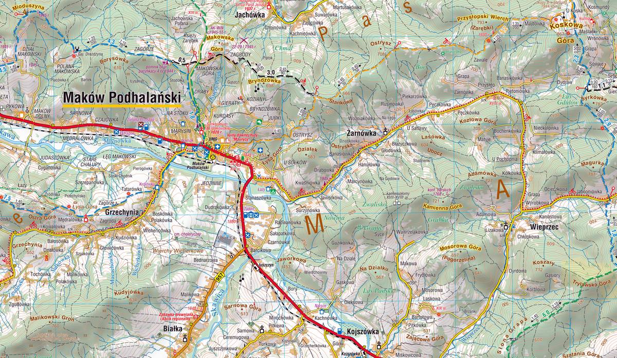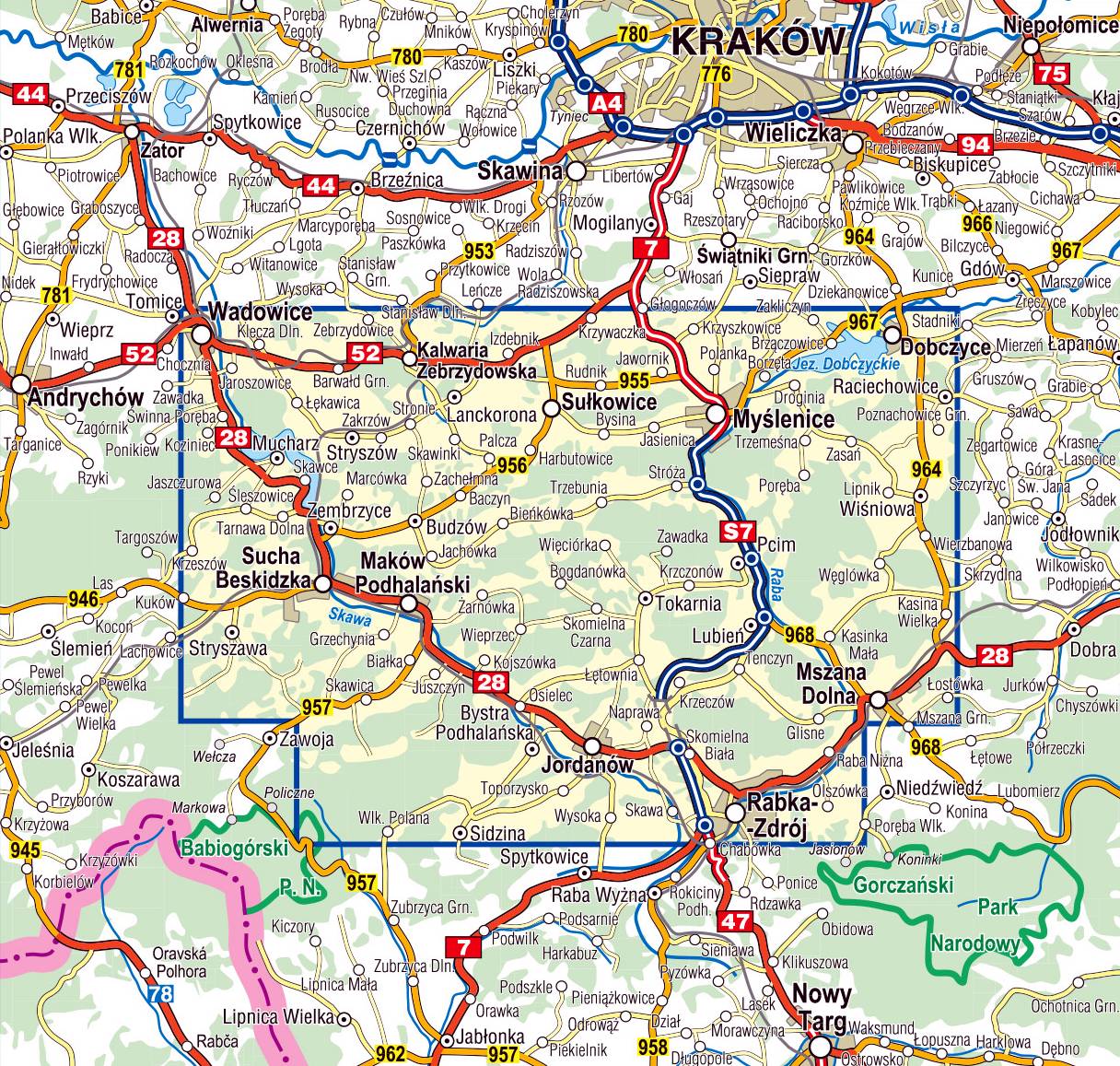 Jest to mapa jednostronna w skali 1:50'000. Przedstawia cały obszar Beskidu Makowskiego (zwanego też Beskidem Średnim lub Myślenickim) oraz fragmenty Beskidów: Małego, Wyspowego i Żywieckiego. Swym zasięgiem obejmuje tereny od Wadowic na zachodzie po Dobczyce i Rabkę-Zdrój na wschodzie.