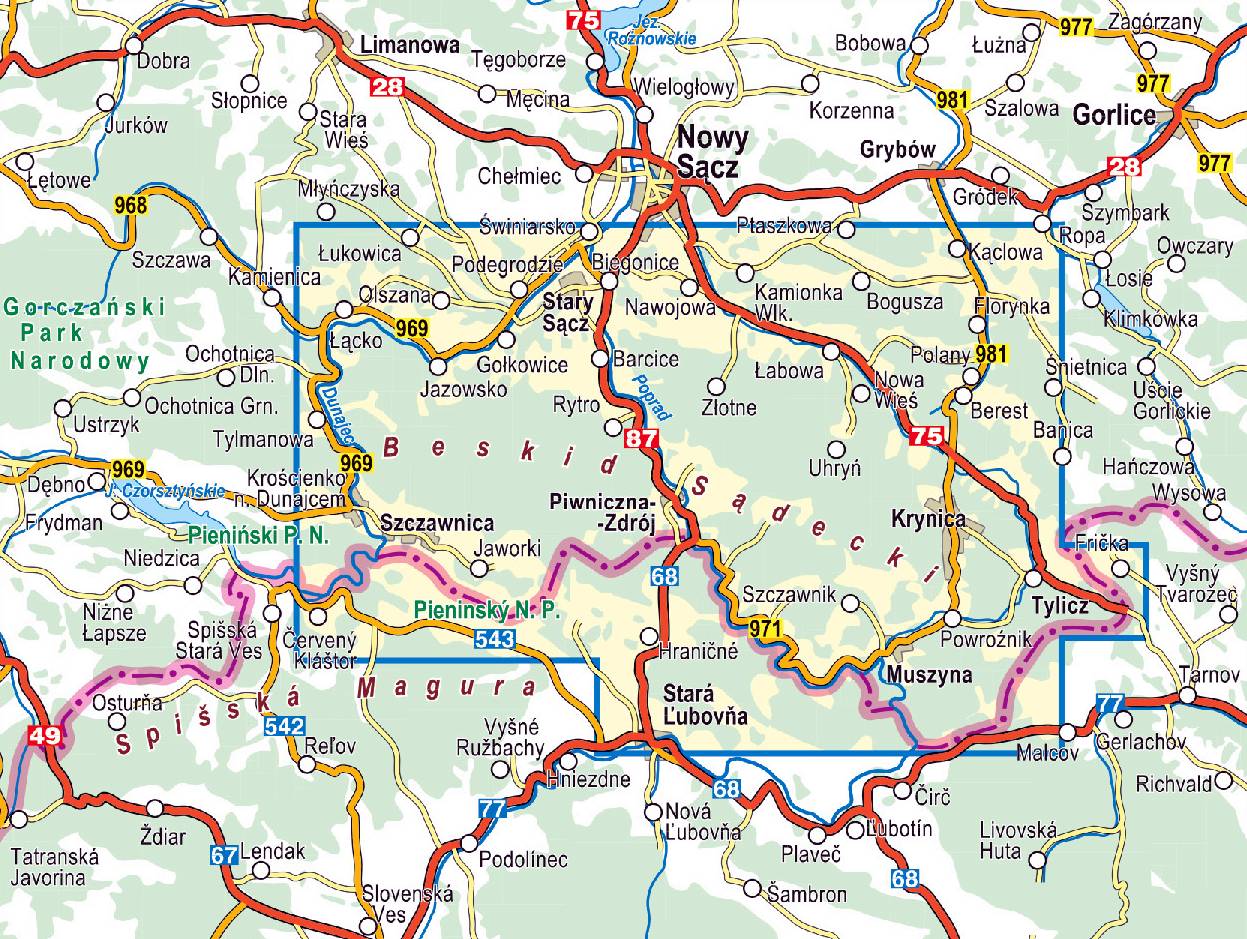 Jest to mapa jednostronna w skali 1:50'000. Obejmuje cały obszar Beskidu Sądeckiego, od doliny Dunajca na zachodzie i północnym zachodzie, po Krynicę, Tylicz i Muszynkę na południowym wschodzie. Zawiera także obszar Małych Pienin, Pieninek oraz część Pienin Właściwych. Na mapie znajduje się również fragment Beskidu Niskiego: Gór Grybowskich.