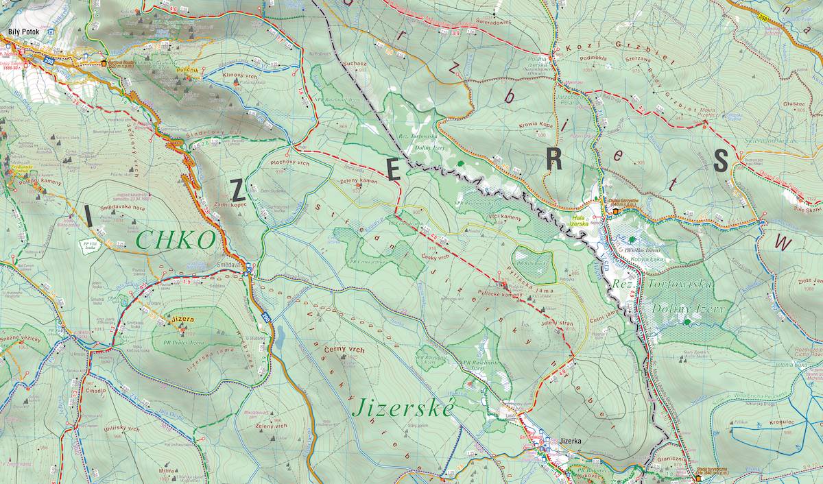 - obszary chronione, w tym polskie i czeskie rezerwaty, granice parku narodowego i krajobrazowego,