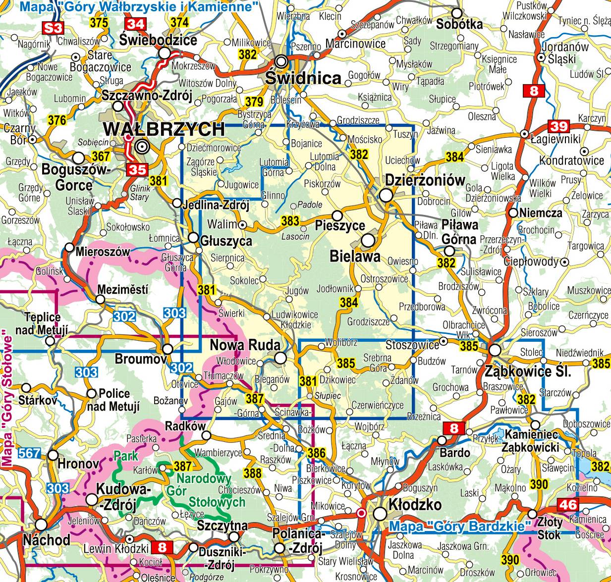 Góry Sowie – mapa turystyczna w skali 1:35'000 to szczegółowe i praktyczne opracowanie obejmujące jeden z najciekawszych regionów Sudetów Środkowych. Zasięg mapy wyznaczają: Wałbrzych na północnym zachodzie, Broumov na zachodzie, Radków na południu oraz Srebrna Góra na południowym wschodzie – dzięki czemu obejmuje ona zarówno najpopularniejsze, jak i mniej znane zakątki tego pasma.