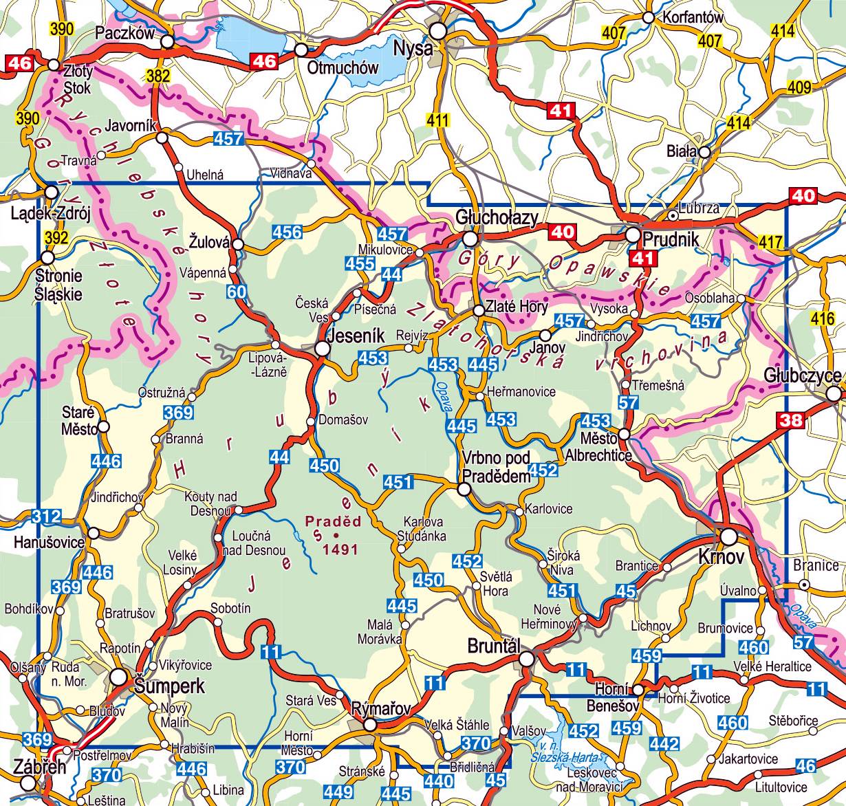 Zasięg mapy wyznaczają miejscowości: Lądek Zdrój; Stronie Śląskie; Šumperk; Rymarov; Krnov; Bohusov; Prudnik.