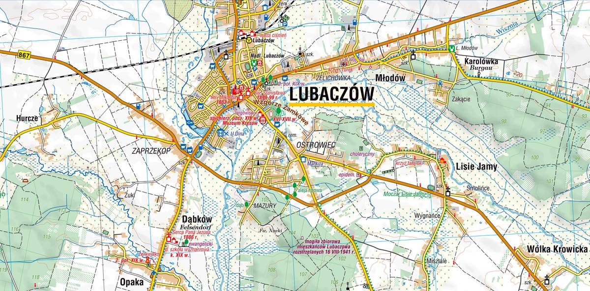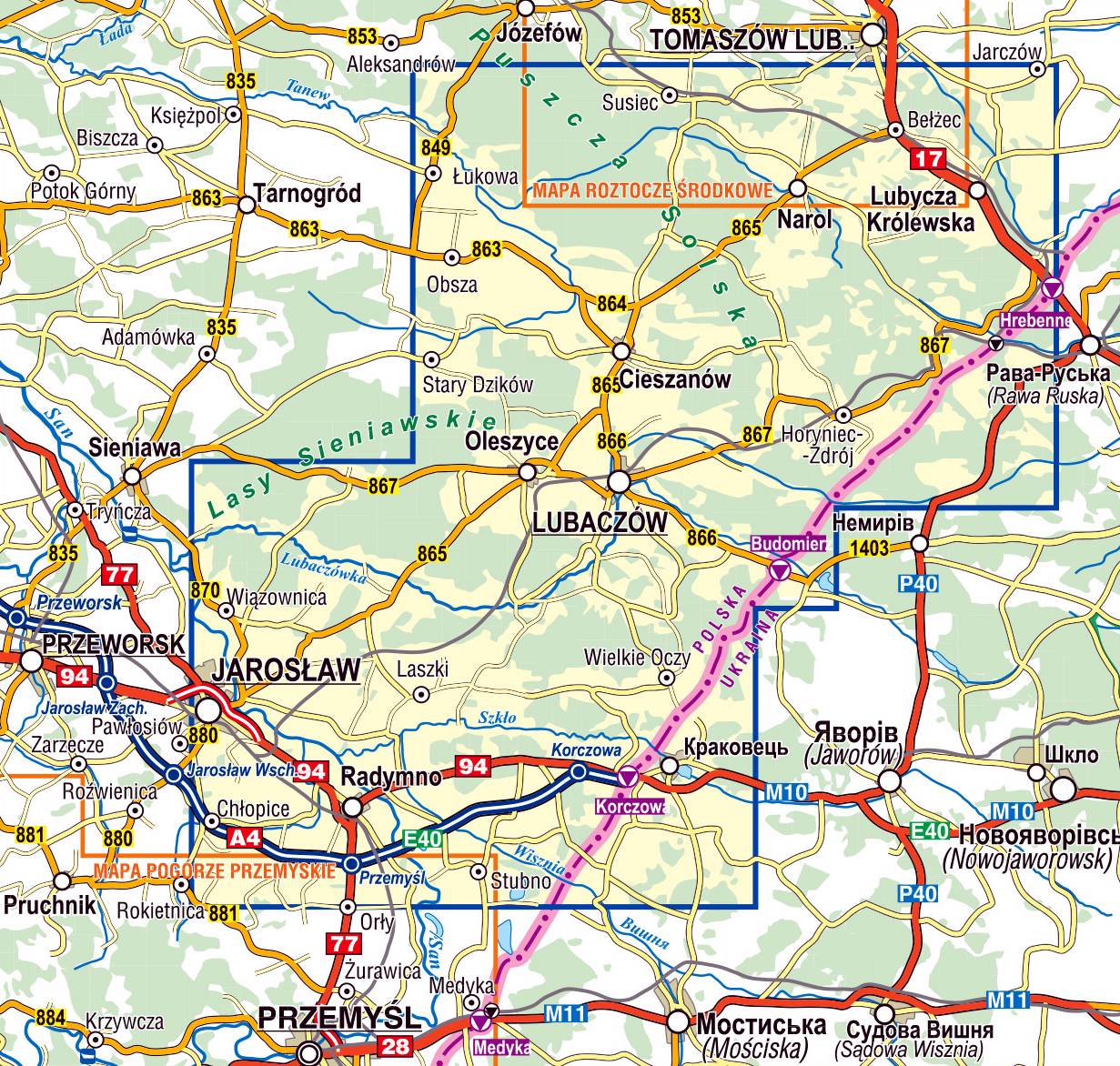 Jest to mapa dwustronna w skali 1:50'000. Przedstawia region geograficzny w południowo-wschodniej Polsce. Sięga od Jarosławia po Korczowę na południu (cała autostrada A4) aż po Bełżec i Susiec na północy. Prezentuje niezwykle atrakcyjny turystycznie, choć wciąż mało popularny i niezbyt rozpoznawalny region, a w tym takie „miejscówki”, jak: Lubaczów, Oleszyce, Horyniec-Zdrój, Narol, Ruda Różaniecka i inne.