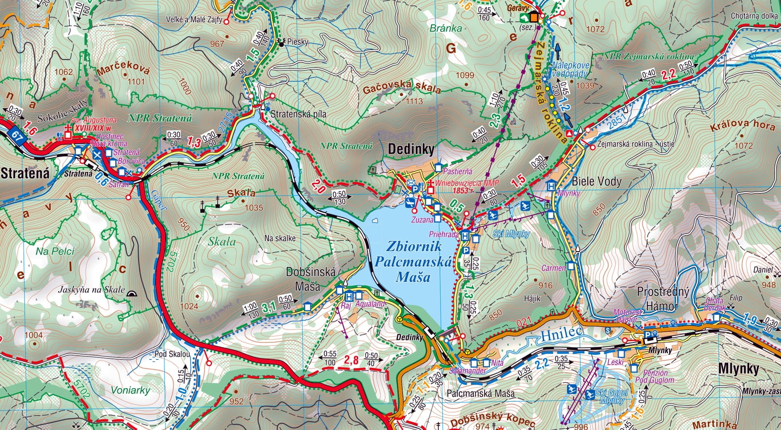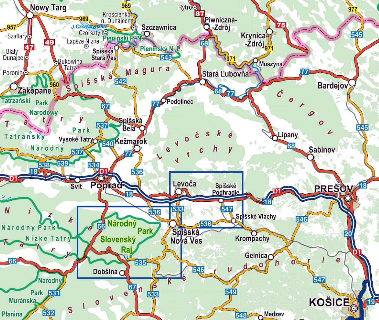 Mapa przedstawia cały Słowacki Raj oraz jego okolice. Na pierwszej stronie znajdziemy mapę w skali 1:35'000 obejmującą Park Narodowy Słowacki Raj i jego najbliższe otoczenie. Na odwrocie znajduje się opis turystyczno-krajoznawczy oraz mapa okolic pozwalająca na dotarcie do Spiskiego Zamku, Spiskiej Kapituły i Lewoczy.