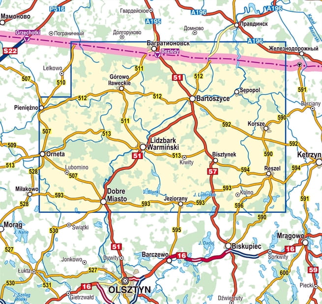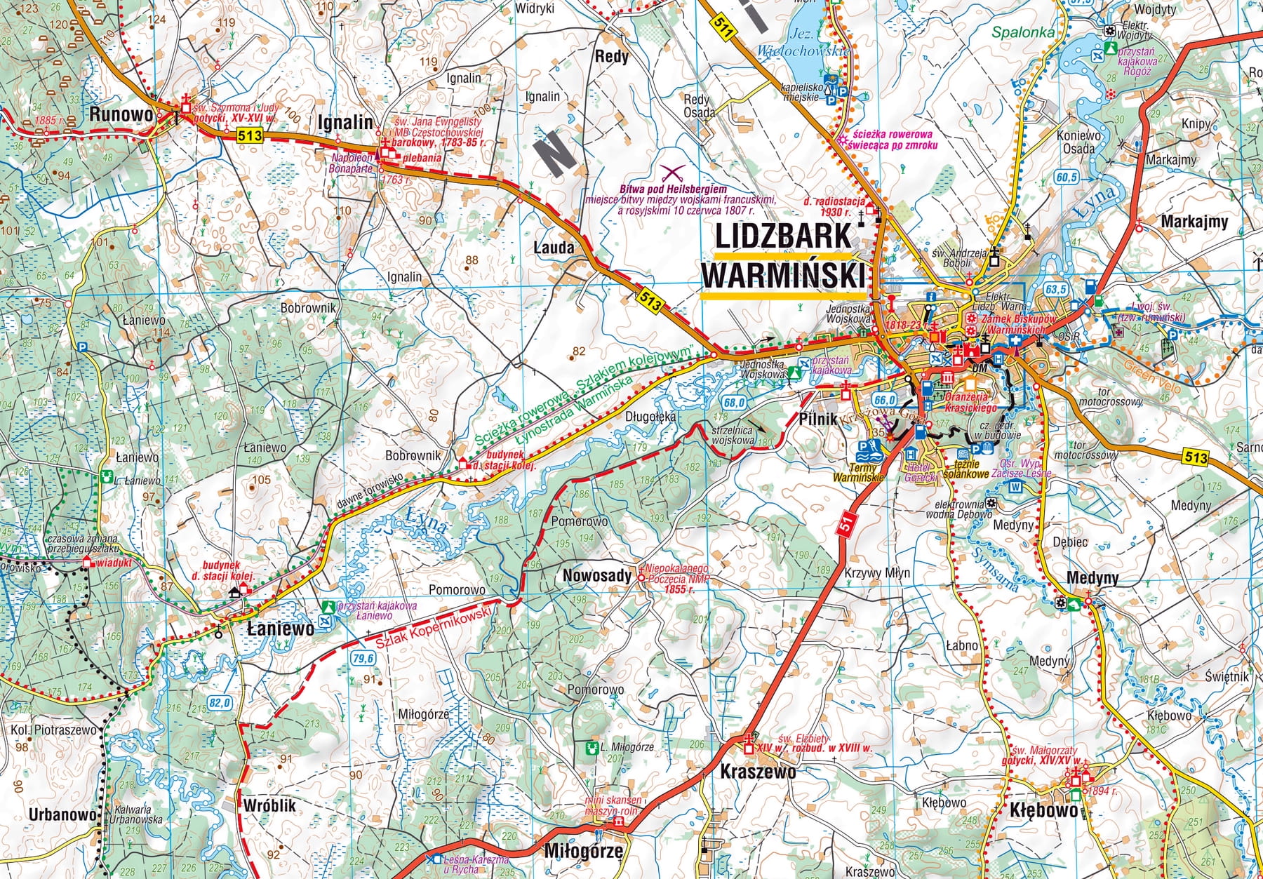 Mapa posiada zaktualizowaną treść topograficzną: zweryfikowane przebiegi szlaków pieszych, rowerowych i kajakowych (z kilometrażem i prezentacją nowych przystani kajakowych na Łynie) i lokalizację najważniejszych atrakcji turystycznych.