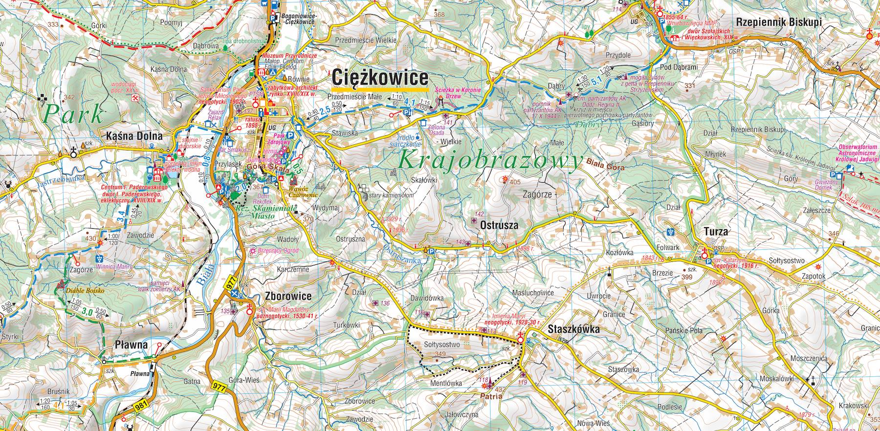 Pogórze Ciężkowickie – mapa turystyczna w skali 1:50'000 to szczegółowe opracowanie przedstawiające niezwykle malowniczy i wciąż niedoceniany region leżący na pograniczu województw małopolskiego i podkarpackiego. Zasięg mapy wyznaczają: Wojnicz i Jamna na zachodzie, Tarnów i Pilzno na północy, Jasło na wschodzie oraz Biecz na południu.