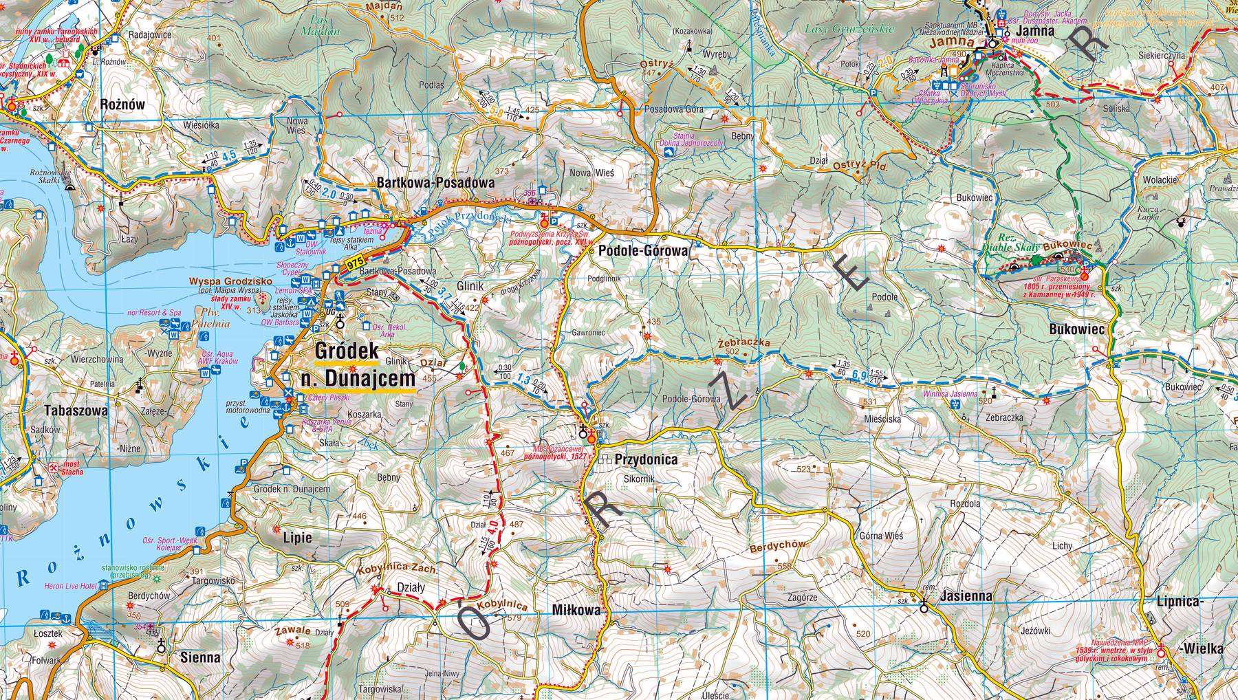 Mapa została wykonana z zastosowaniem cieniowania podkreślającego rzeźbę terenu, co ułatwia orientację w terenie i planowanie tras. Jest to idealne narzędzie dla turystów pieszych, rowerzystów, miłośników przyrody oraz osób zmotoryzowanych pragnących odkrywać Pogórze Rożnowskie.