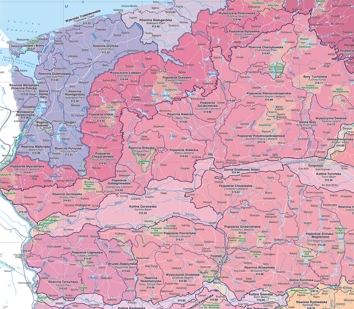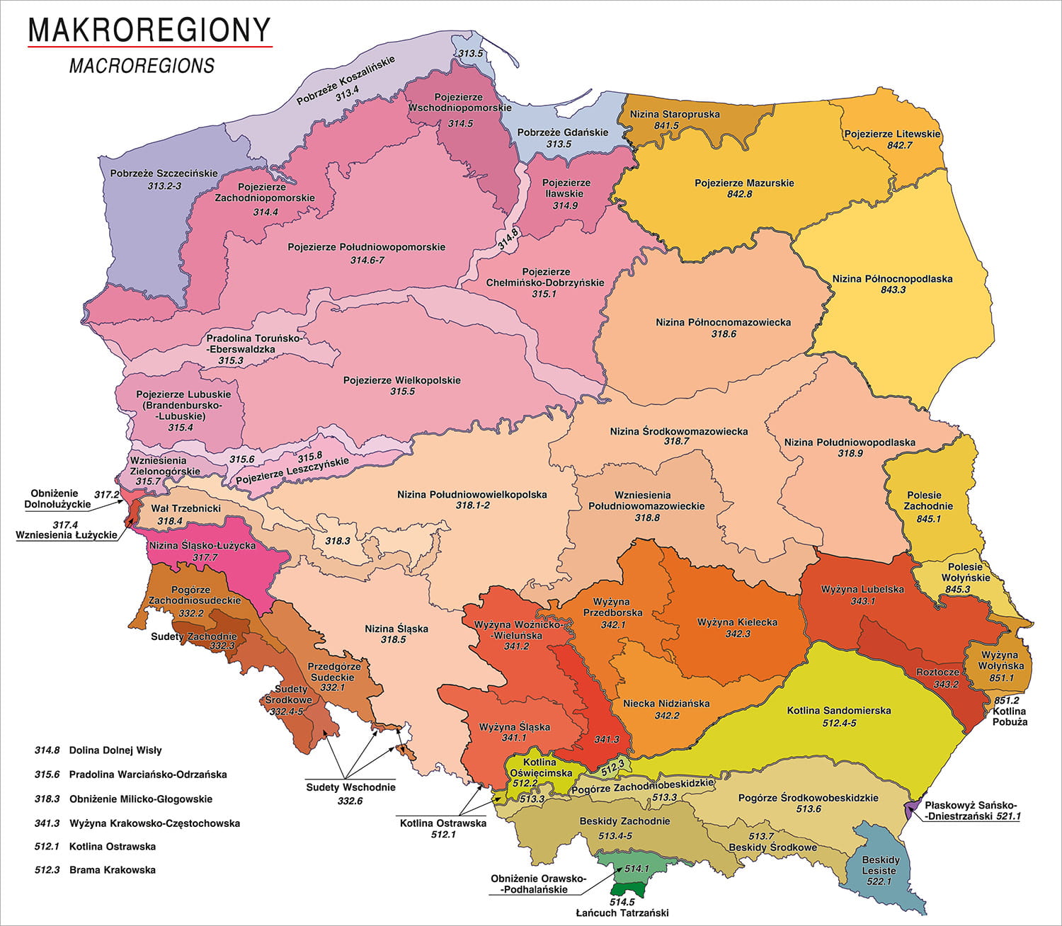 Mapa mezoregionów oraz mapy Karpat i Sudetów zawierają nie tylko nazwy i numery jednostek. Znajdują się tam wybrane miejscowości, rzeki i jeziora, punkty wysokościowe, które ułatwią identyfikację przestrzenną regionów. Pokazaliśmy również tereny najbardziej cenne pod względem przyrodniczym, czyli parki narodowe i krajobrazowe, a z drugiej strony te najbardziej przekształcone przez człowieka – tereny aglomeracji i intensywnej zabudowy. Zamieściliśmy dodatkowo mapy ukształtowania terenu oraz zalesienia Polski, obie z naniesionymi granicami mezoregionów. Mamy nadzieję, że te wszystkie informacje staną się dla odbiorców mapy podstawowym narzędziem wstępnego poznawania różnych obszarów polskich. Liczymy także na to, iż będą zachętą do dalszego szukania wiedzy na ich temat, a być może nawet do ich odwiedzenia.