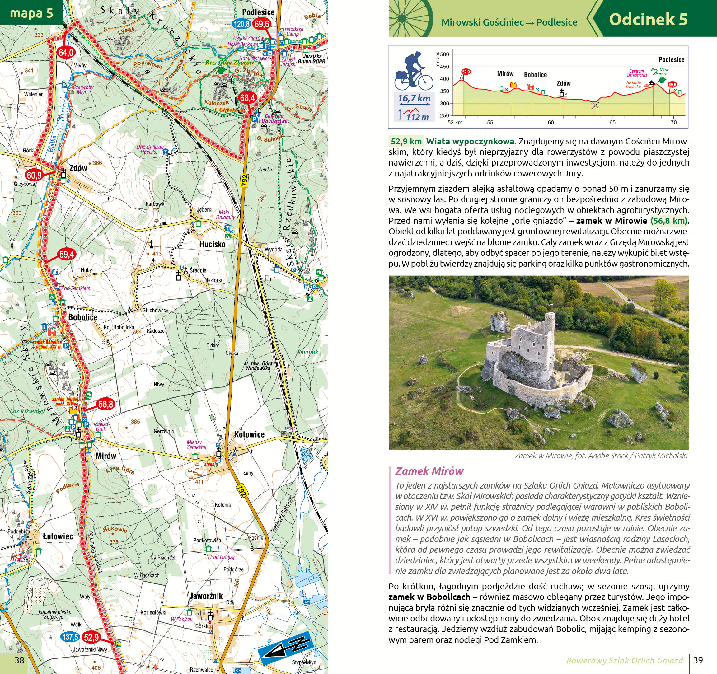 Przewodnik obejmuje trasę z Częstochowy do Krakowa (z możliwością jazdy w obu kierunkach), a przejrzysta struktura – mapa, parametry odcinka, opis i noclegi – pozwala szybko odnaleźć najważniejsze informacje.