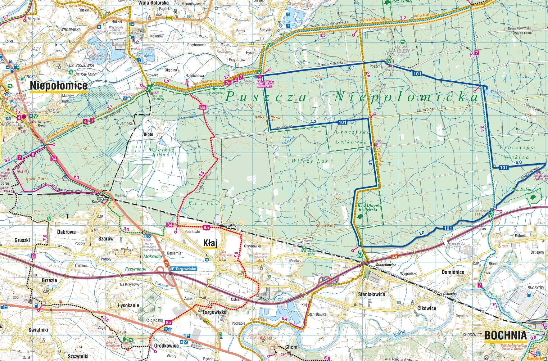 Na mapie sieć oznakowanych szlaków rowerowych uzupełniono dodatkowymi trasami, stanowiącymi w większości propozycje wyjazdu z Krakowa, ale również pomysł na wycieczki rowerowe tam, gdzie brakuje szlaków, jak chociażby w Puszczy Niepołomickiej. Proponowane trasy nie są w terenie oznakowane, to koncepcja przejażdżki rowerowej z wykorzystaniem niniejszej mapy.