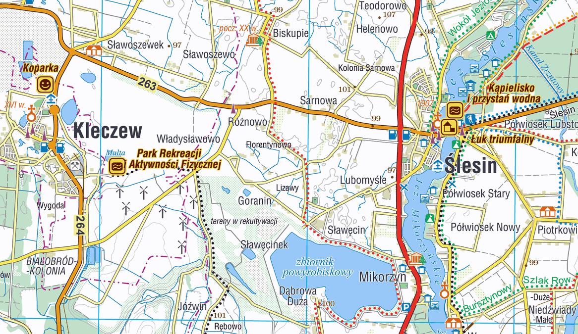 Obejmuje ona obszar wyznaczony przez miejscowości: od zachodu - Trzemeszno, Pyzdry; od południa - Rychwał, Turek, Uniejów; od wschodu - Kłodawa, Chodecz, od północy - Piotrków Kujawski. W środku Słupca, Konin, Koło z ponad 90-kilometrowym odcinkiem doliny Warty. Znajdziemy więc na niej Powidzki Park Krajobrazowy - jeden z najatrakcyjniejszych turystycznie i krajobrazowo fragmentów Wielkopolski, Puszczę Pyzdrską, Nadwarciański Park Krajobrazowy, wyniosłe wzgórza Pagórków Złotogórskich z jednym z najwyższych szczytów Wielkopolski - Złotą Górą (191 m n.p.m.), Wysoczyznę Kłodawską i płd. część Pojezierza Kujawskiego z obszarem źródliskowym Noteci. Oczywiście w centrum mapy pokazano popularne akweny z licznymi ośrodkami wodnymi połączone kanałem Ślesińskim - jeziora Gopło, Ślesińskie, Pątnowskie i Gosławickie. Znajdziemy tu również wiele obszarów poprzemysłowych, aktualnie pieczołowicie rekultywowanych i przywracanych rolnictwu lub przeznaczanych na cele rekreacyjne.