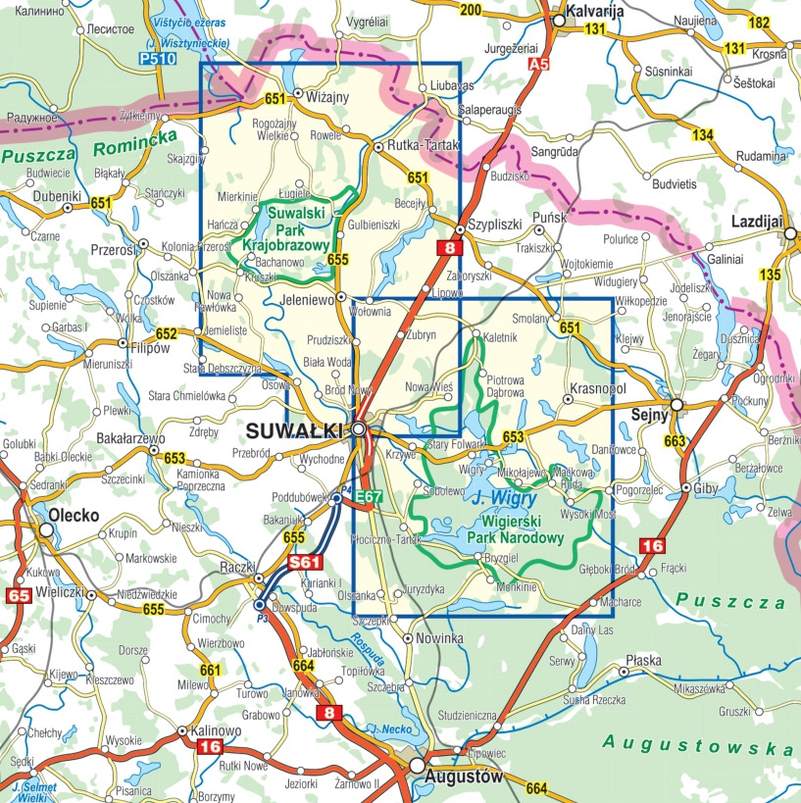 Jest to mapa dwustronna w skali 1:40'000. Przedstawia najatrakcyjniejszy turystycznie fragment Suwalszczyzny, obejmujący Wigierski Park Narodowy i Suwalski Park Krajobrazowy. Jedna strona mapy obejmuje WPN, druga – SPK, wspólna część to fragment Suwałk. Zasięg mapy wyznaczają: Wiżajny na północy, Skajzgiry na zachodzie, Jezioro Blizno na południu oraz Pogorzelec na wschodzie.