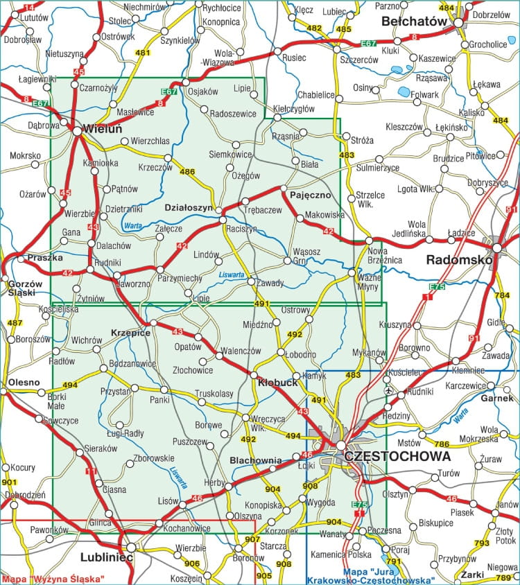 Jest to mapa dwustronna w skali 1:50 000. Przedstawia region geograficzny w południowej Polsce, rozciągający się pomiędzy Wieluniem a Częstochową. Zasięg mapy wyznaczają: Osjaków na północy, Radłów na zachodzie, Lubliniec na południu i Częstochowa na wschodzie. Obszar mapy obejmuje: Wieluń, Działoszyn, Pajęczno, Kłobuck, Blachownię i Częstochowę.